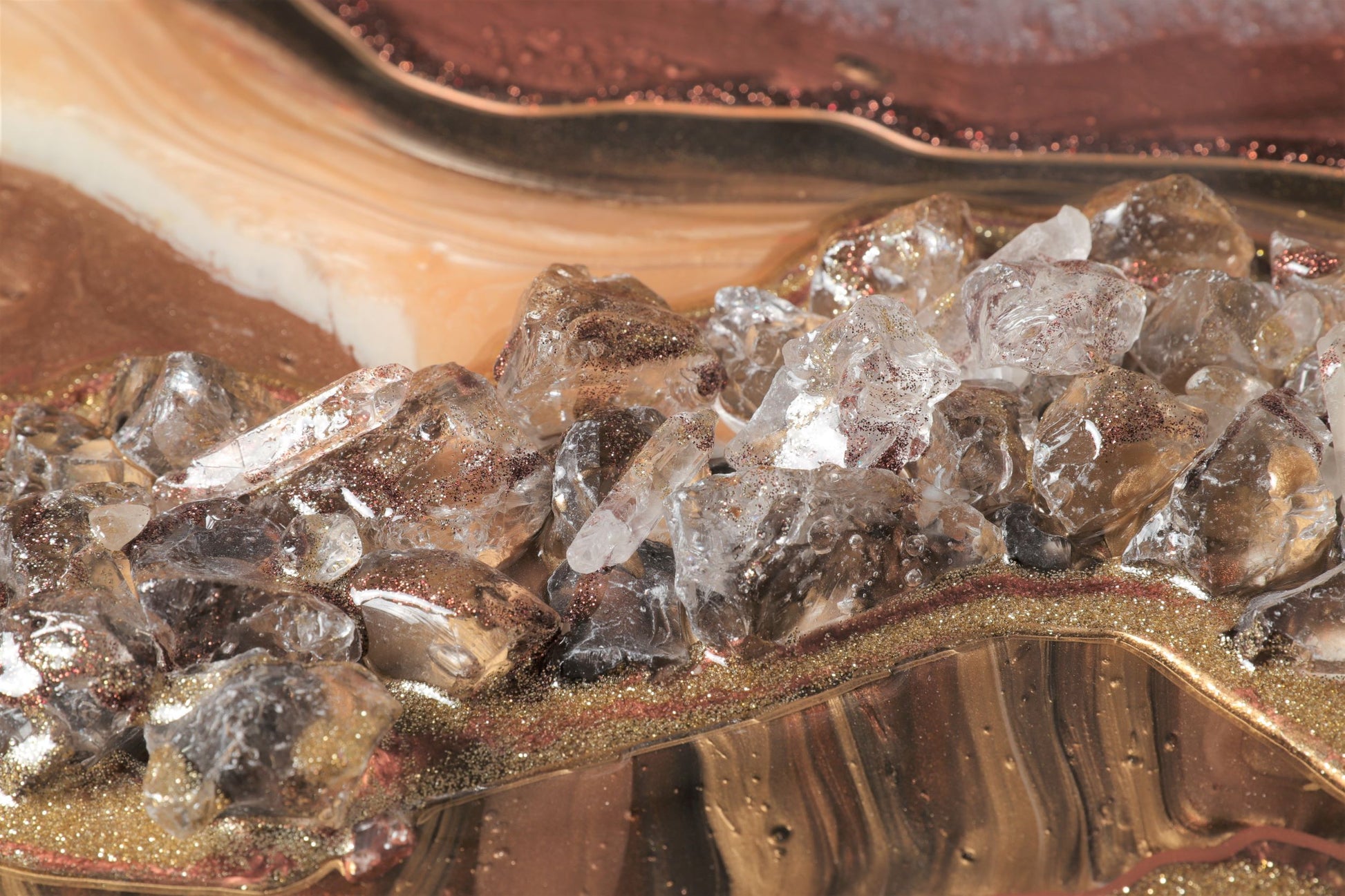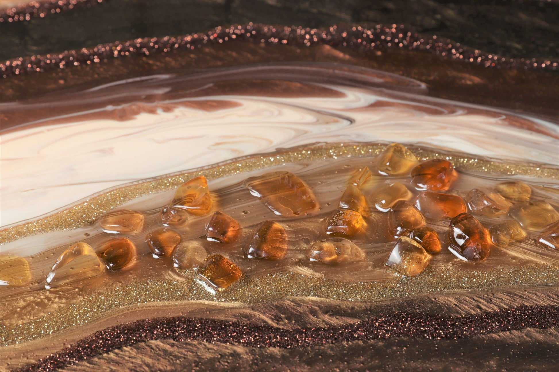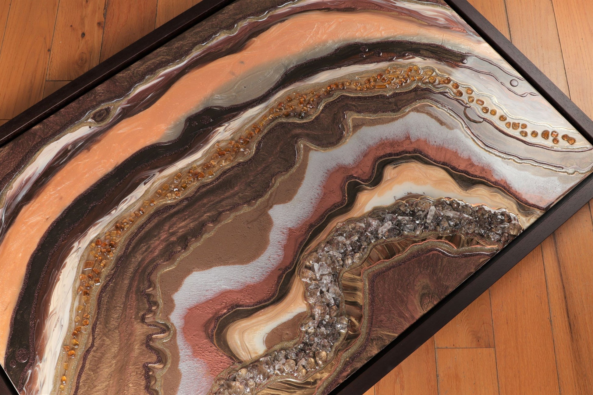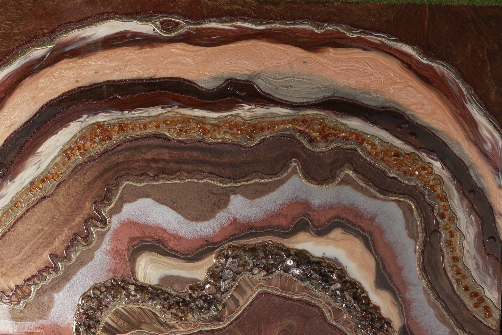 This breath taking Frequency Art an original geode-style resin abstract painting was meticulously crafted using Wendy's innovative artistic methods. Layer upon layer, the frequency of abundance was harnessed to infuse depth and vibrancy into this exquisite artwork. It showcases a palette of rich autumn colours, with tones of browns, golds, coppers, and whites, which evoke the warmth of the changing seasons.