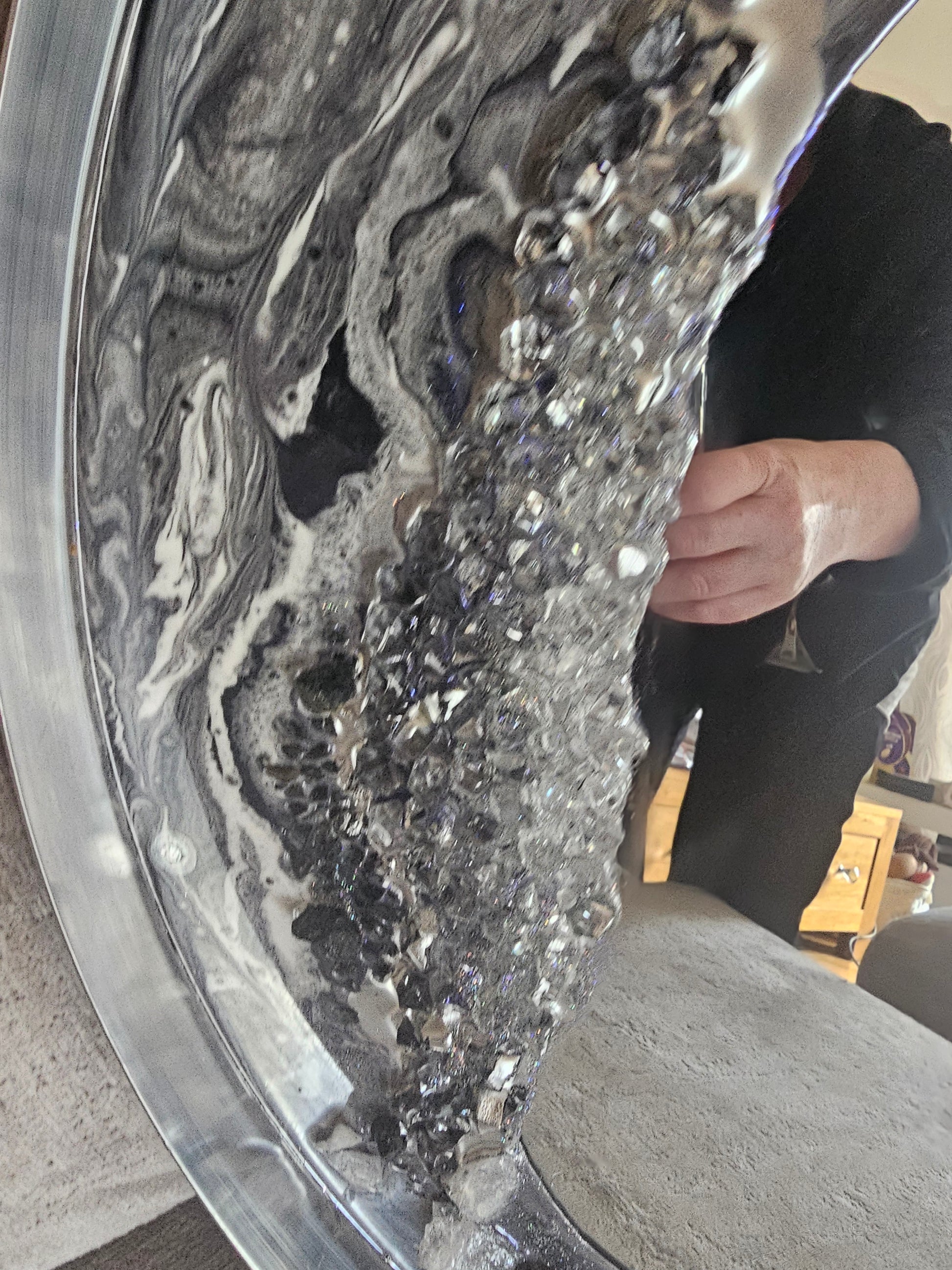 Enhance your space with a handcrafted resin mirror, infused with the healing properties of White Quartz and Black Tourmaline.
