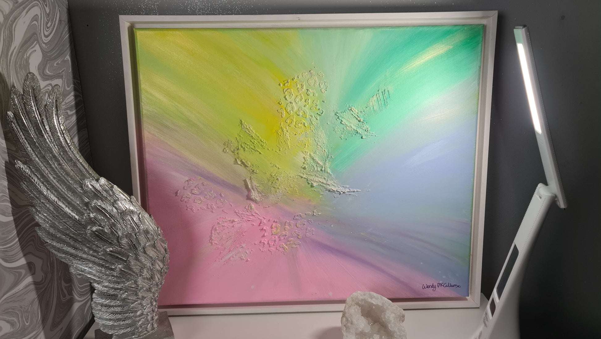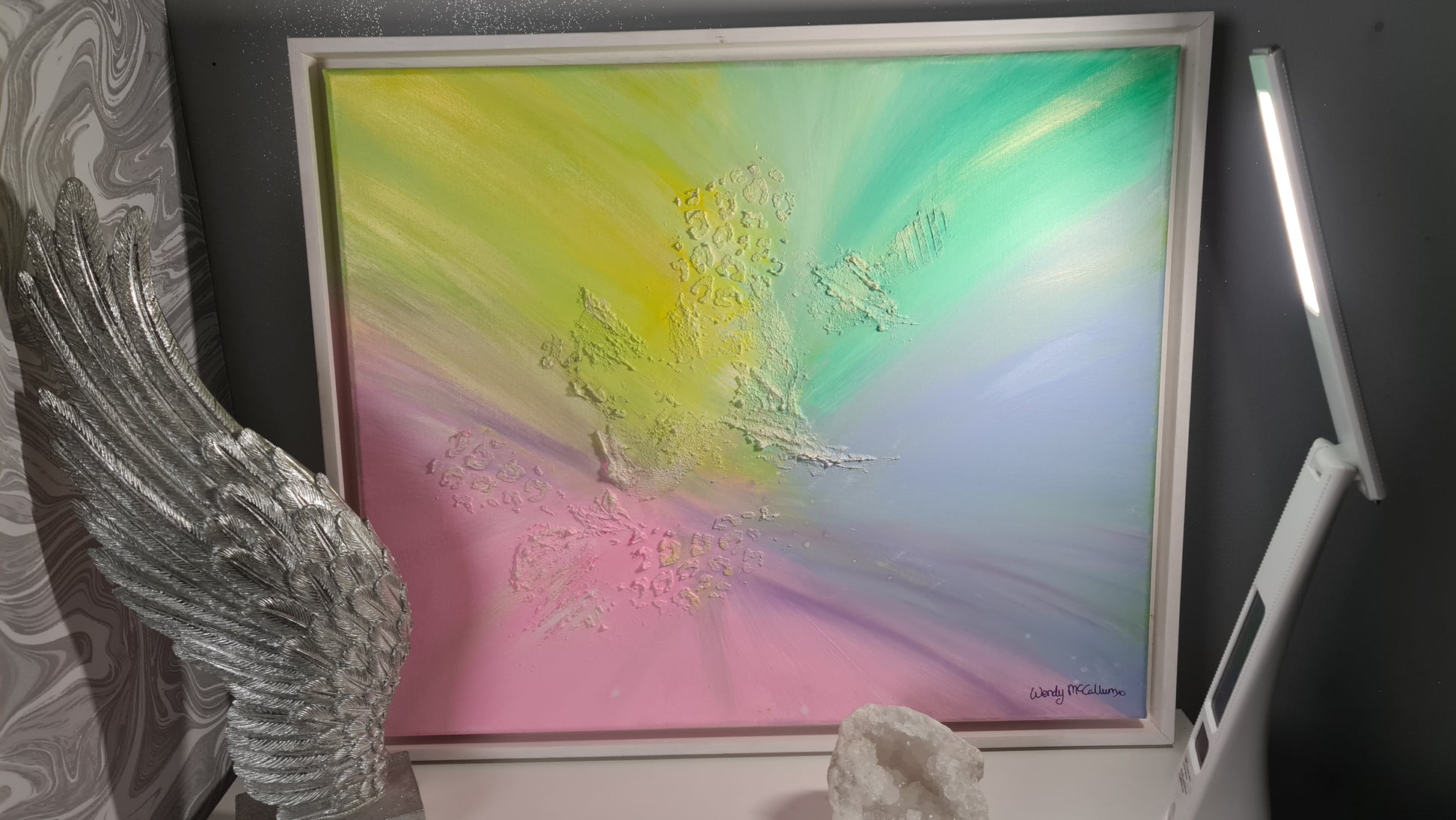 My paintings are channelled, connecting with the collective consciousness, I never know what I am going to paint or what colours I will use until I begin to create the space and in doing so colours come into my mind a sense of peace and unconditional love sweeps over me and I simply get lost in the energy of creation.