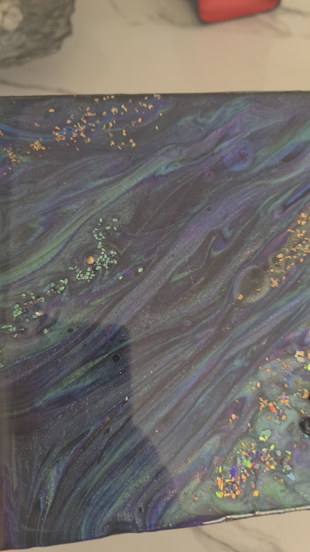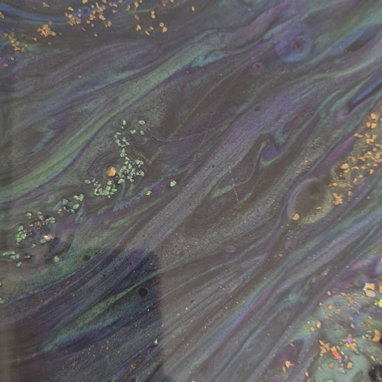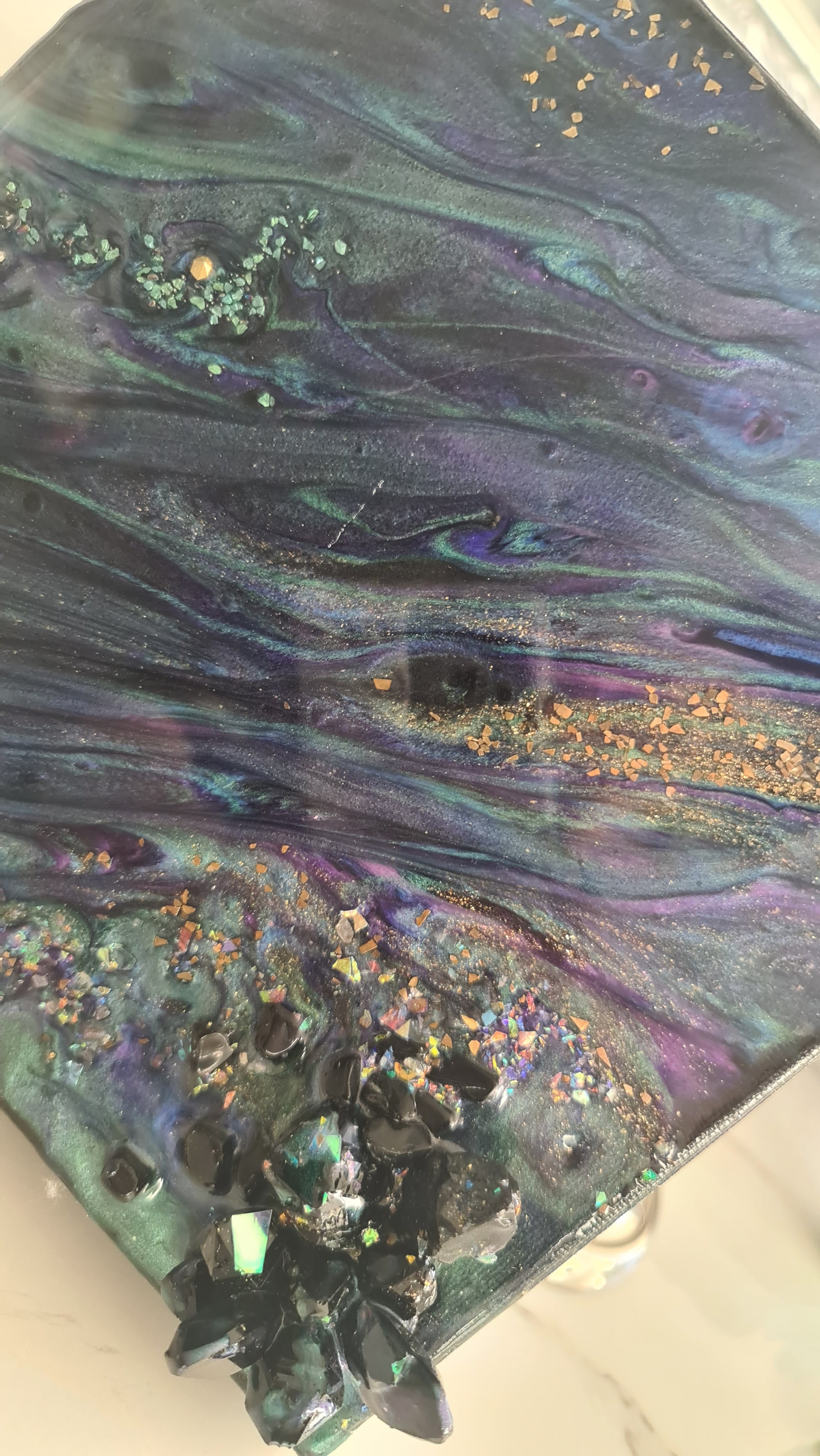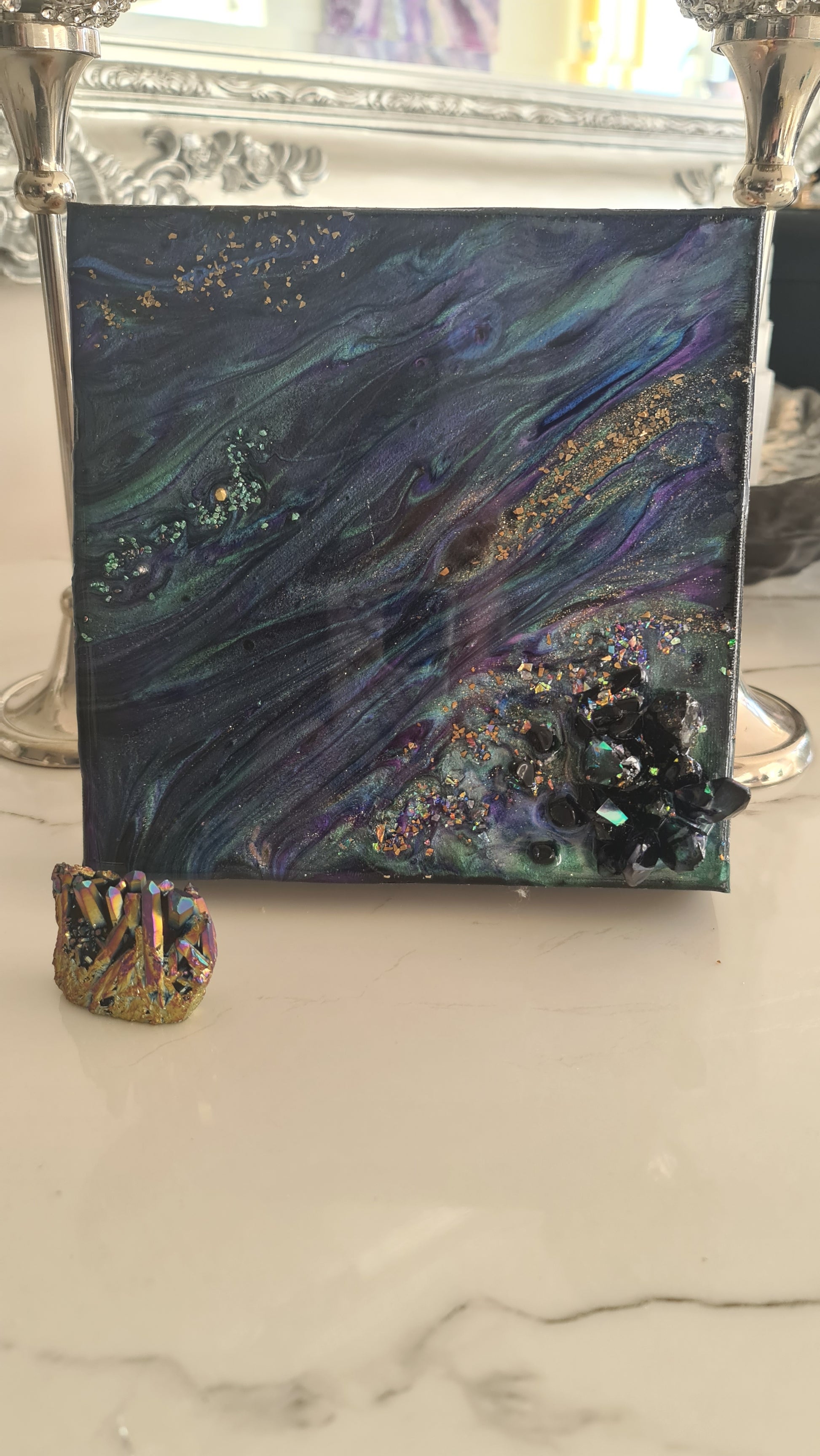 small resin geode style frequency art, adorned with a captivating palette of amazing vibrant pigments in black, purple, blue, green, and accented with gold flakes and white aura quartz, creates a visually stunning masterpiece. This 20cmx20cm piece on a deep canvas serves as a harmonious fusion of art and energy, with potential benefits for the physical, emotional, mental, and etheric bodies.