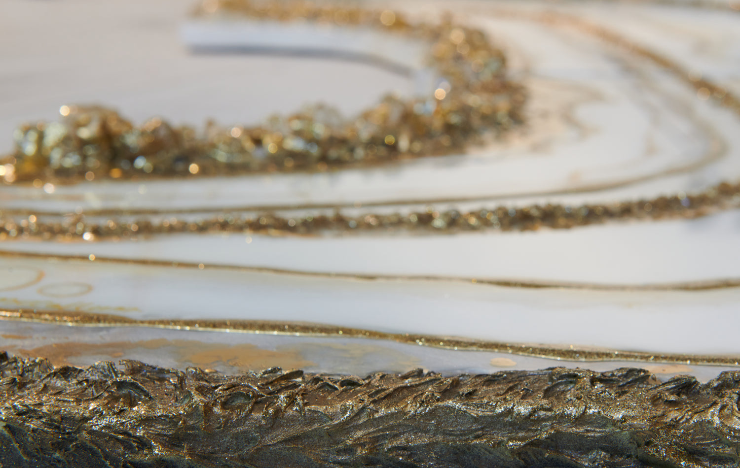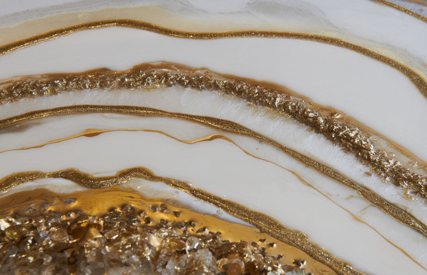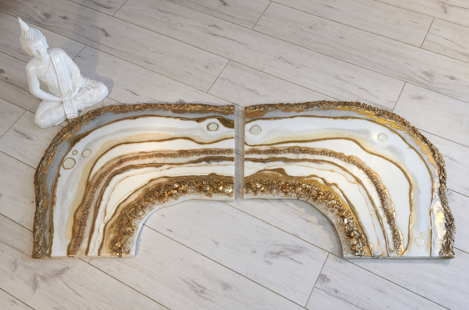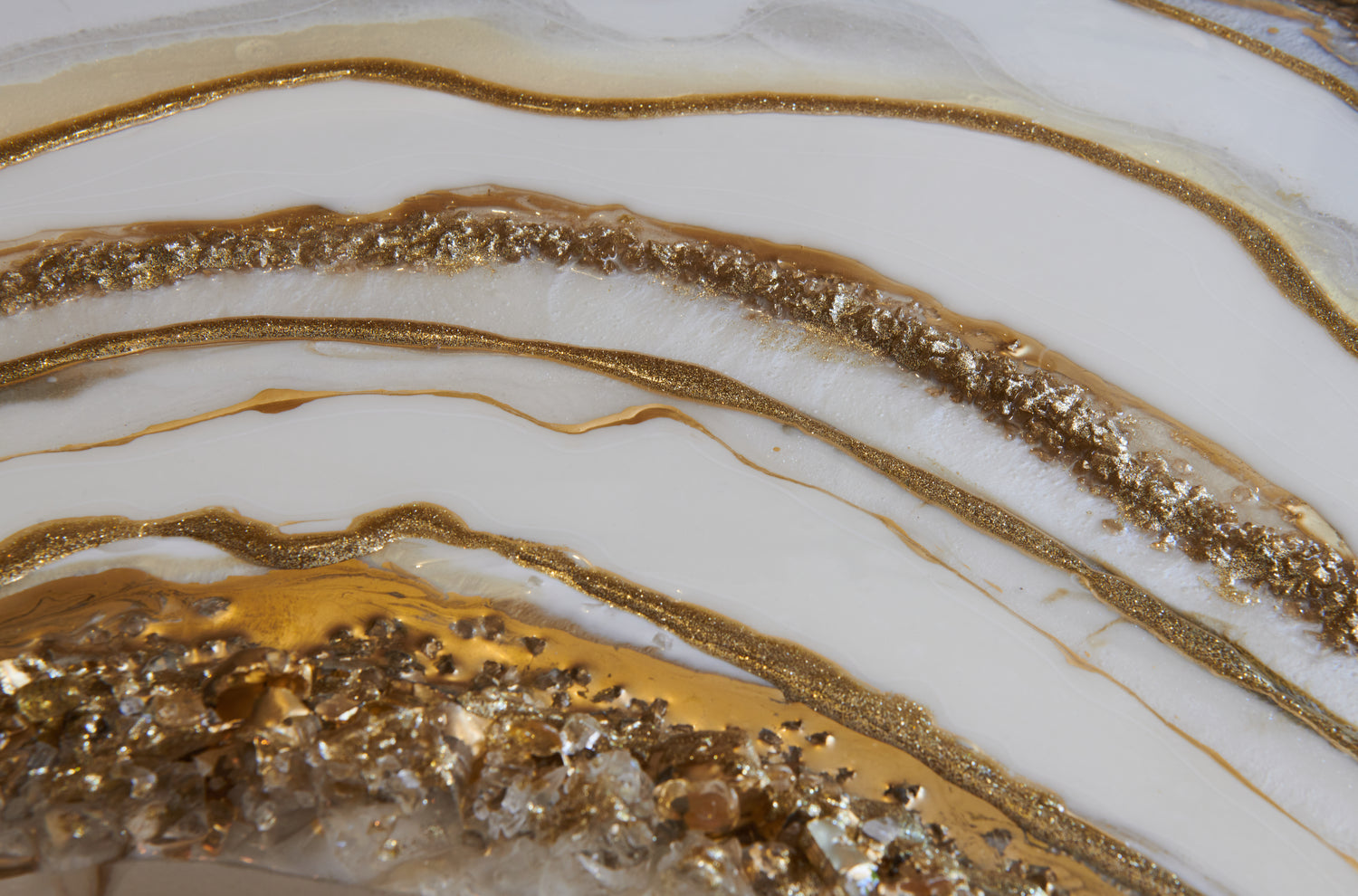 This simply stunning resin abstract painting from was created using Wendy’s innovative techniques using layer upon layer of resin to create a depth within this art work, this eye-catching 3d piece is in mesmerising shades of whites and golds, using citrine and clear quartz crystals ,mixed medias and high quality pigments.