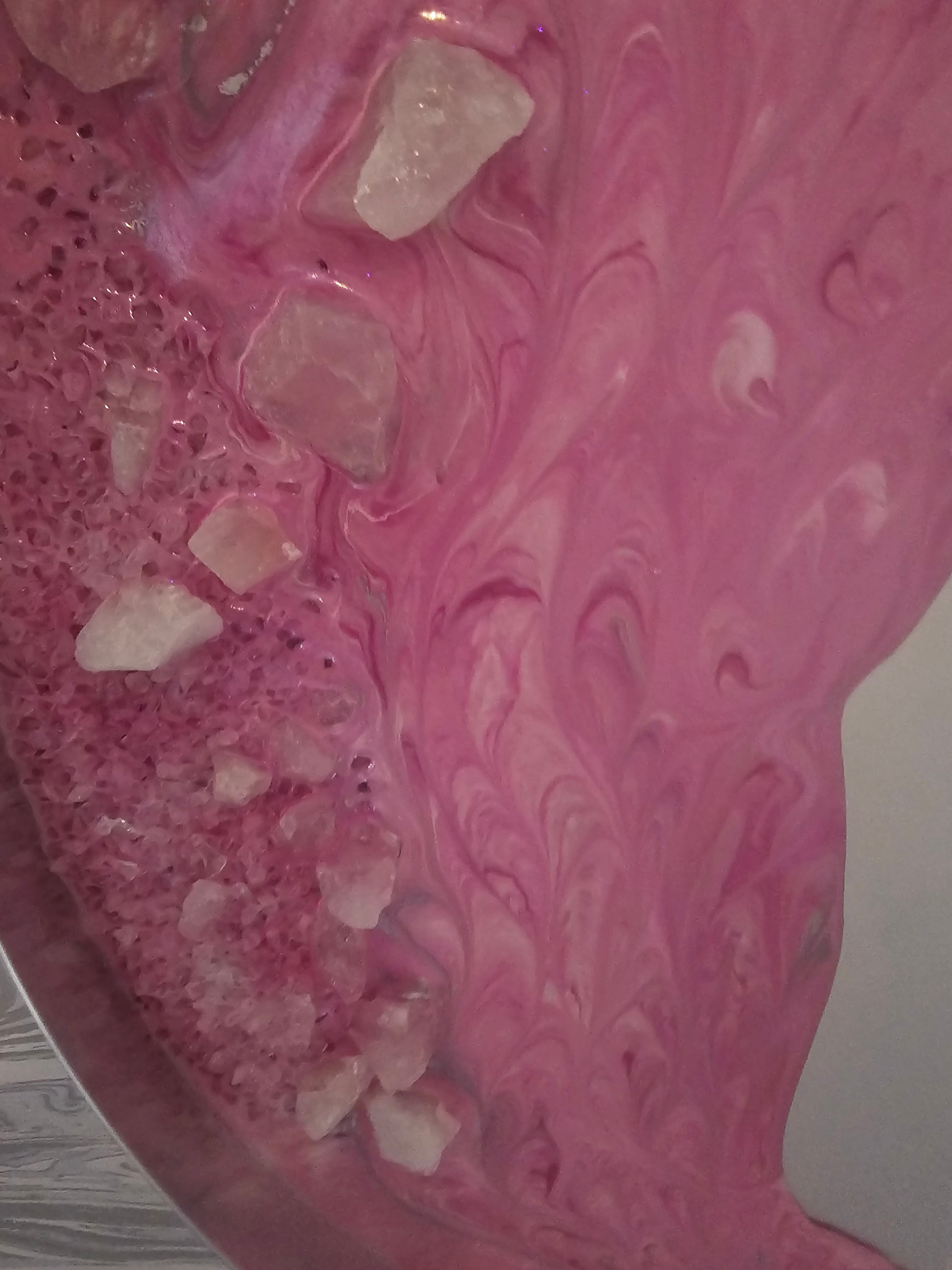 Introducing Wendy's exquisite collection of frequency art resin mirrors, meticulously crafted with the radiant energy of Rose Quartz, known as the 'Heart Stone,' symbolizing boundless love and profound peace. Infused with the essence of unconditional love, Rose Quartz fosters deep inner healing and self-love, while restoring trust and harmony in relationships. Its healing properties extend to enhancing positive affirmations and aiding in emotional healing, making it an essential companion on your journey to inner balance and serenity.