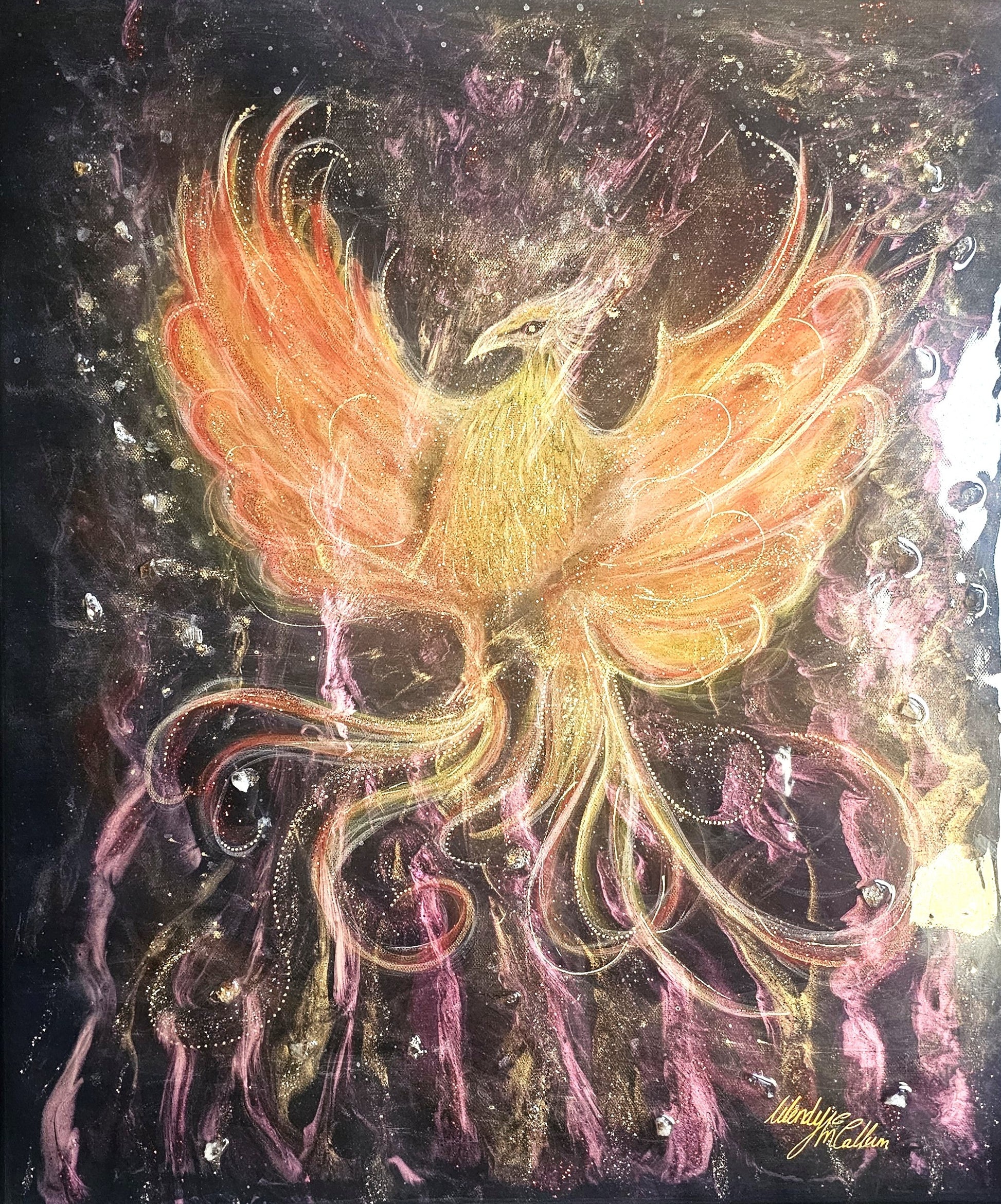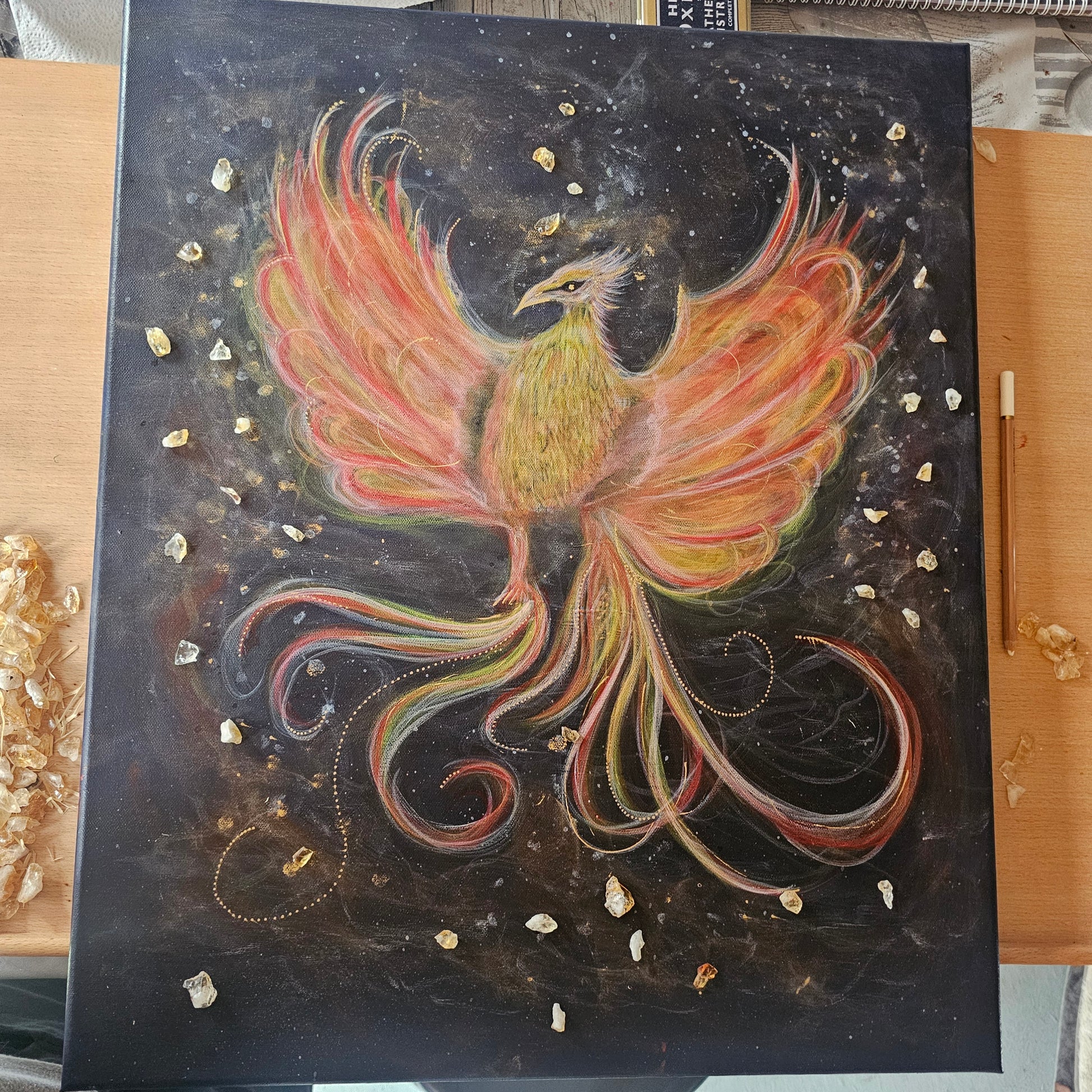 I was guided by the spirit world to create Phoenix Rising—a piece completely different from anything I have ever done before. From the very first layer, I was surrounded by powerful spiritual energies who stepped forward at different stages of its creation, each one leaving their essence within the artwork.