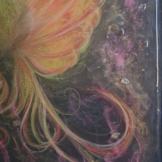 My Phoenix Rising is a radiant creation born from layers of frequency, colour, and light. Just like the Phoenix itself, it embodies rebirth, transformation, and the strength to rise from challenges renewed. Infused with citrine, the powerful stone of joy, abundance, and vitality, it carries the uplifting energy of new beginnings. With every glance, new colours and hidden depths reveal themselves, as though the painting is alive and ever-changing. Depending on how the light touches it, shimmering hues and sparkles emerge, inviting you to lose yourself within its layers and discover something new and magical each time you look.