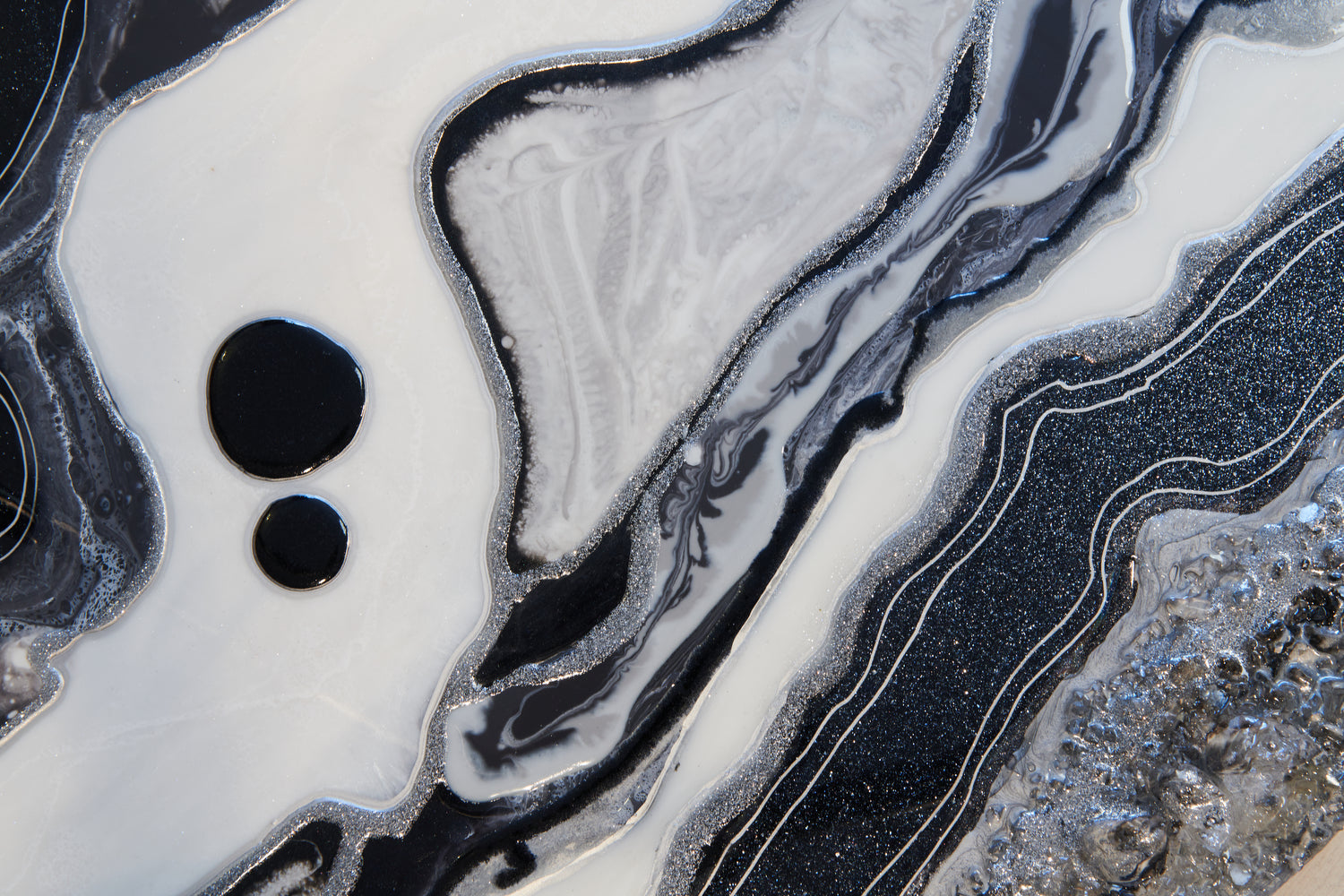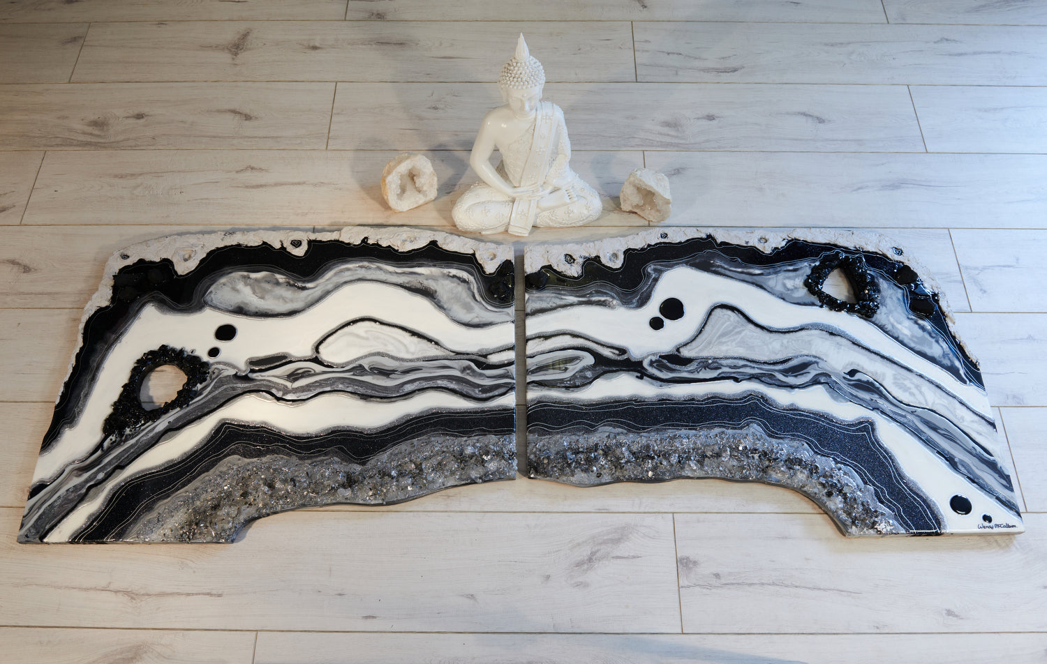 This exquisite two-piece diptych resin abstract painting is not just a piece of art; it's an energetic masterpiece designed to elevate both your space and your well-being. Created using Wendy’s innovative techniques, this stunning geode-style artwork unfolds in a captivating blend of blacks, greys, whites, and silver, creating a mesmerizing visual journey that invites you to explore its intricate layers. Each brushstroke, each texture, has been thoughtfully applied to create depth, drawing you into a soothing world of calm and beauty.